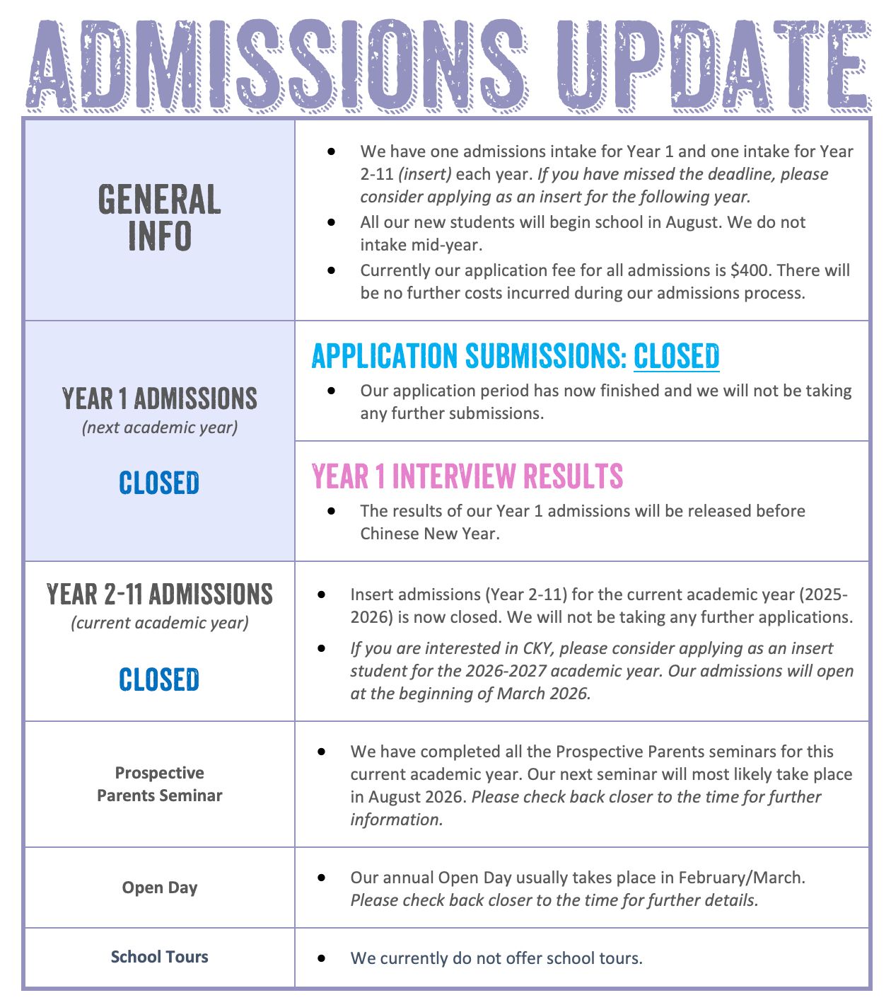 Admissions Update:5th January 2026.